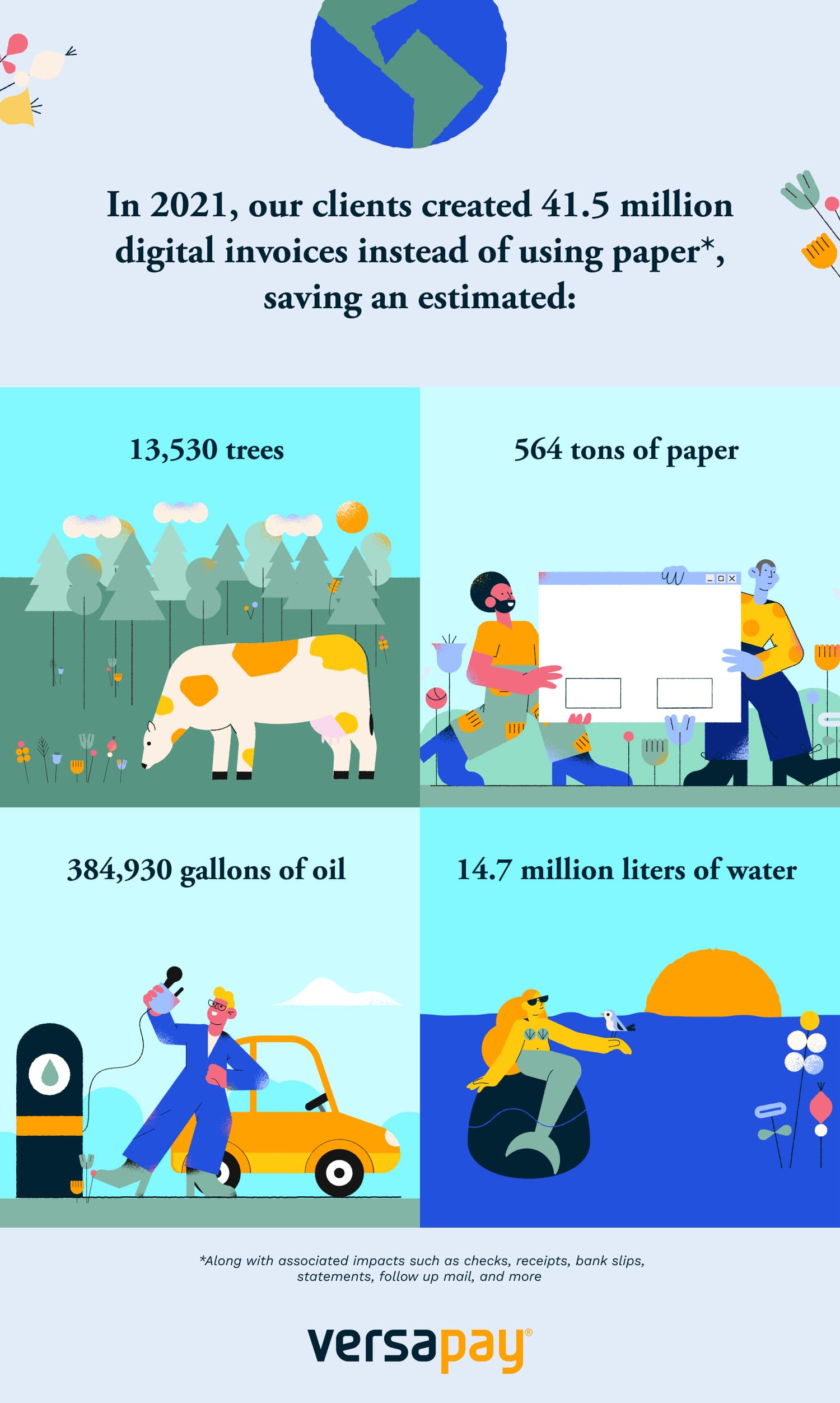 Case in point: In 2021, Versapay clients created 41.5 million e-invoices that would have otherwise been printed on paper. Along with associated impacts such as checks, receipts, bank slips, statements, follow up mail, and more, this resulted in an estimated savings of: