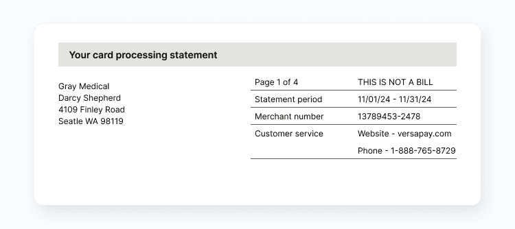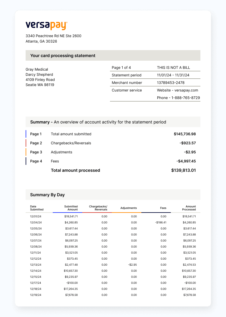 A merchant processing statement lists your company’s transactions, sales, and processing fees and is sent by your payment processor. Note that some processors may call this a credit card processing statement. In this article, we’ll use the two interchangeably.