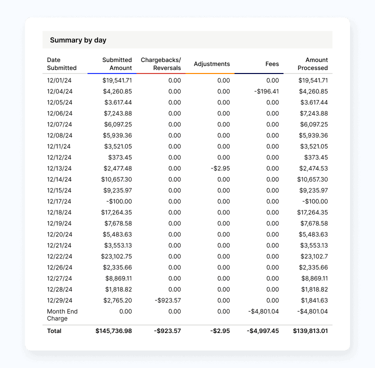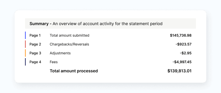 - Transaction summary — This section summarizes your revenue, chargebacks, adjustments, and fees.