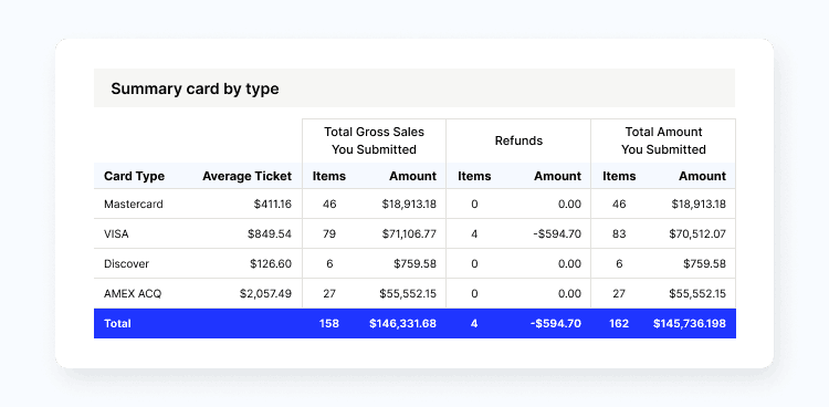 - Summary by card type — This section lists transactions per card type.