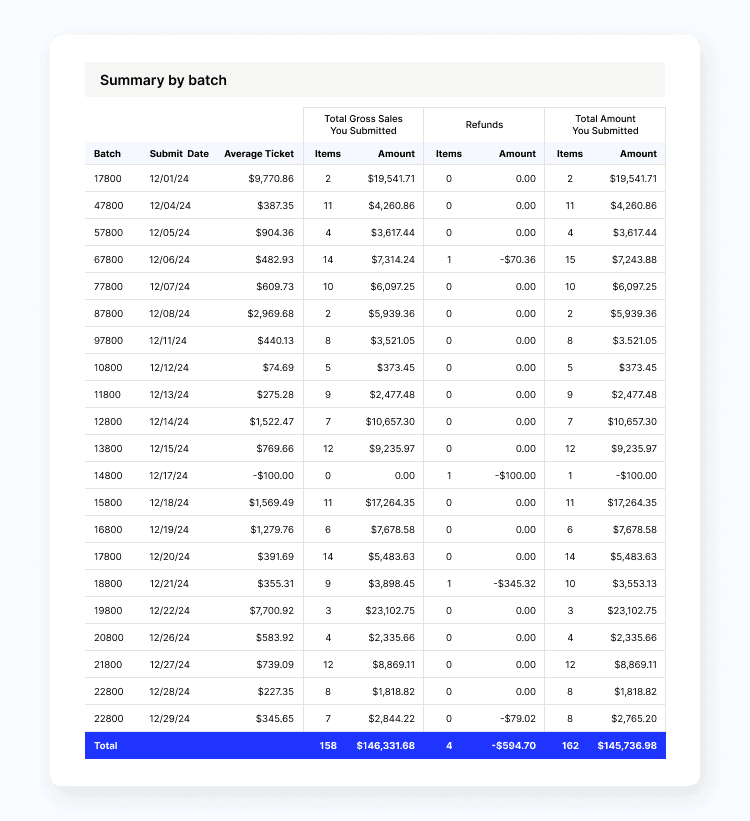 - Summary by batch — This section lists all batch settlement details during the statement period.