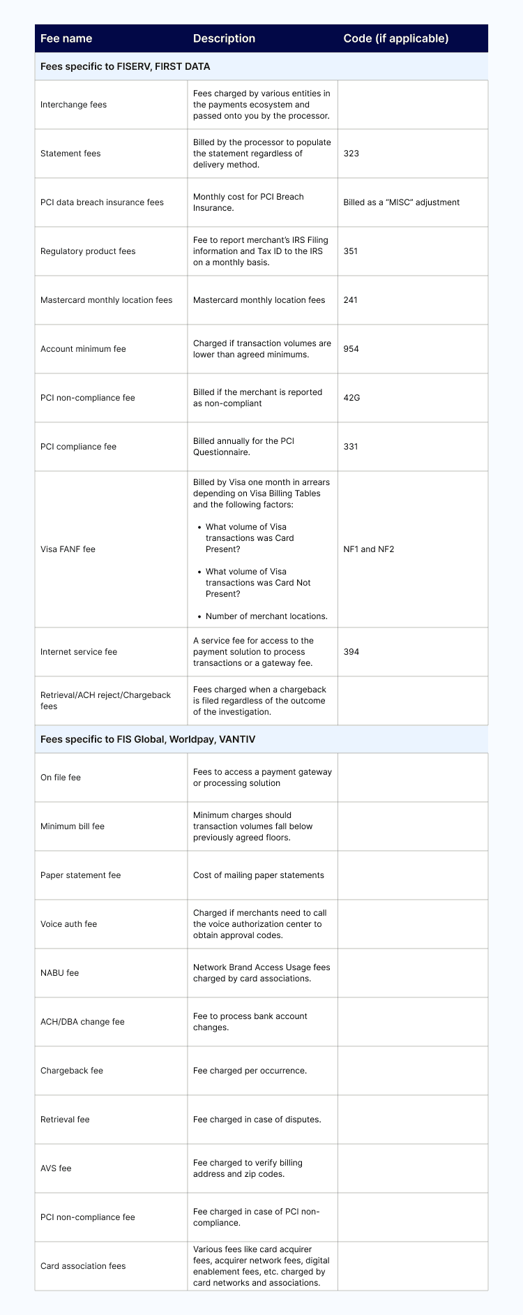 While there routinely is overlap, different payment processors do charge different fees—and define and categorize them differently. Depending on your processor—for example, FISERV or WorldPay—you might come across some unique codes in your merchant processing statement.