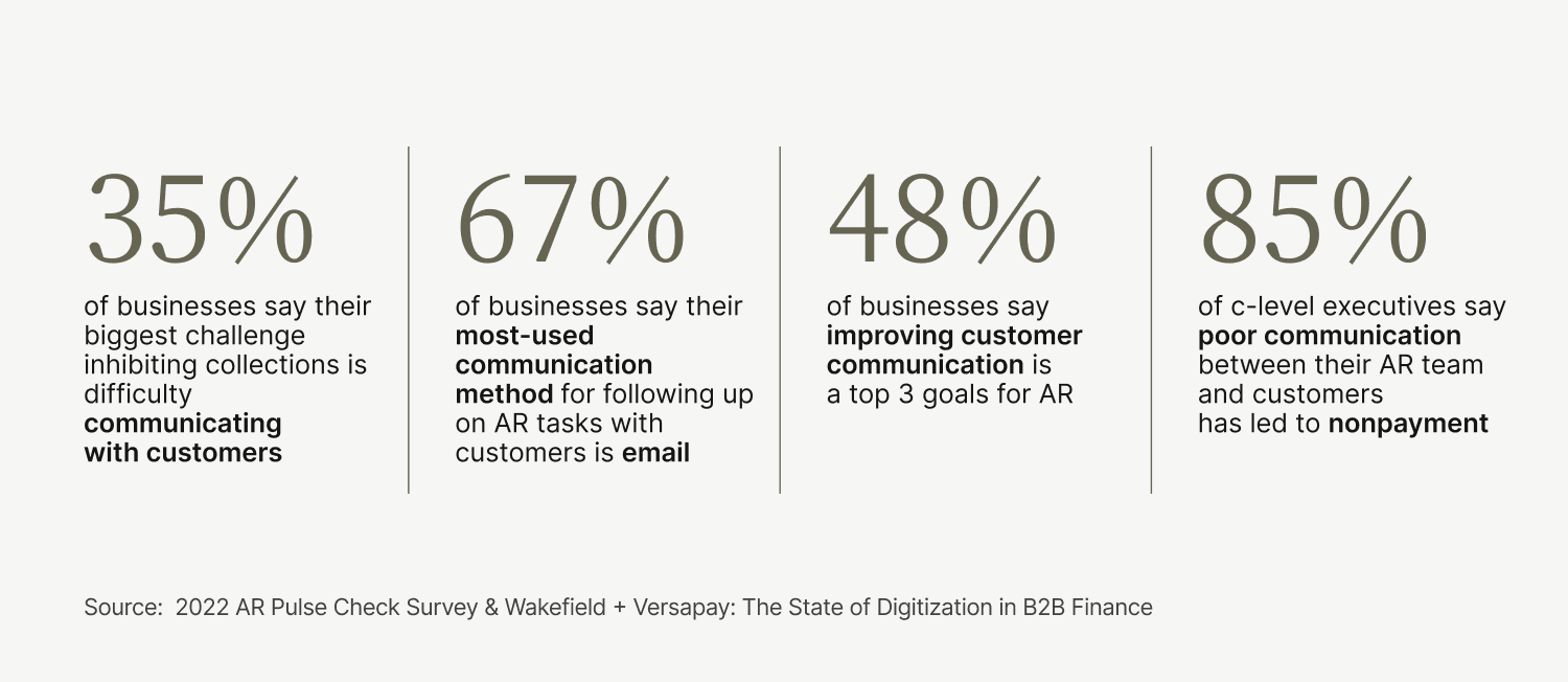 85% of c-level executives say poor communication between their AR team and customers has led to nonpayment (Wakefield and Versapay)