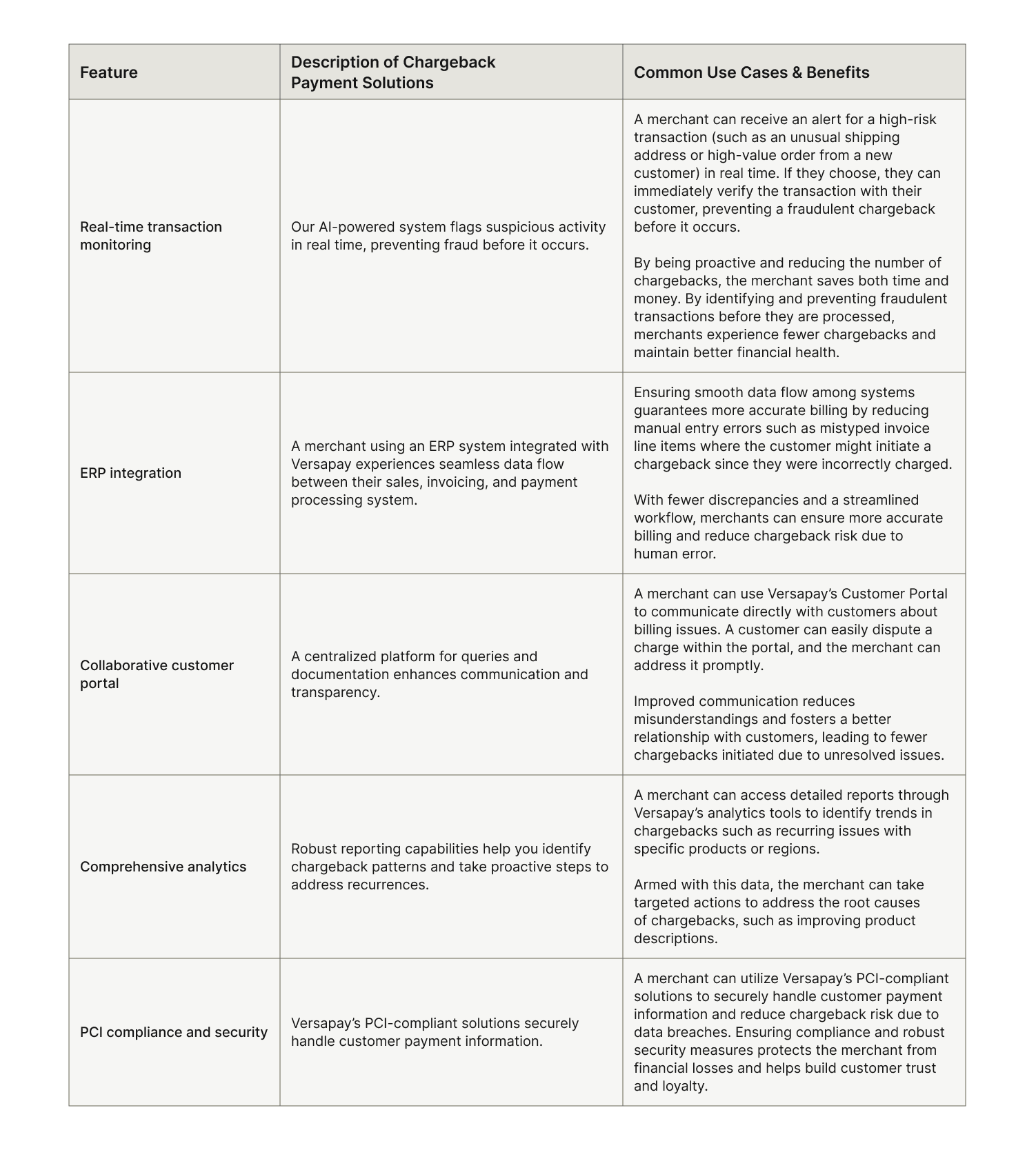 Versapay's payment processing solutions incorporate five key features designed to reduce chargeback risk: