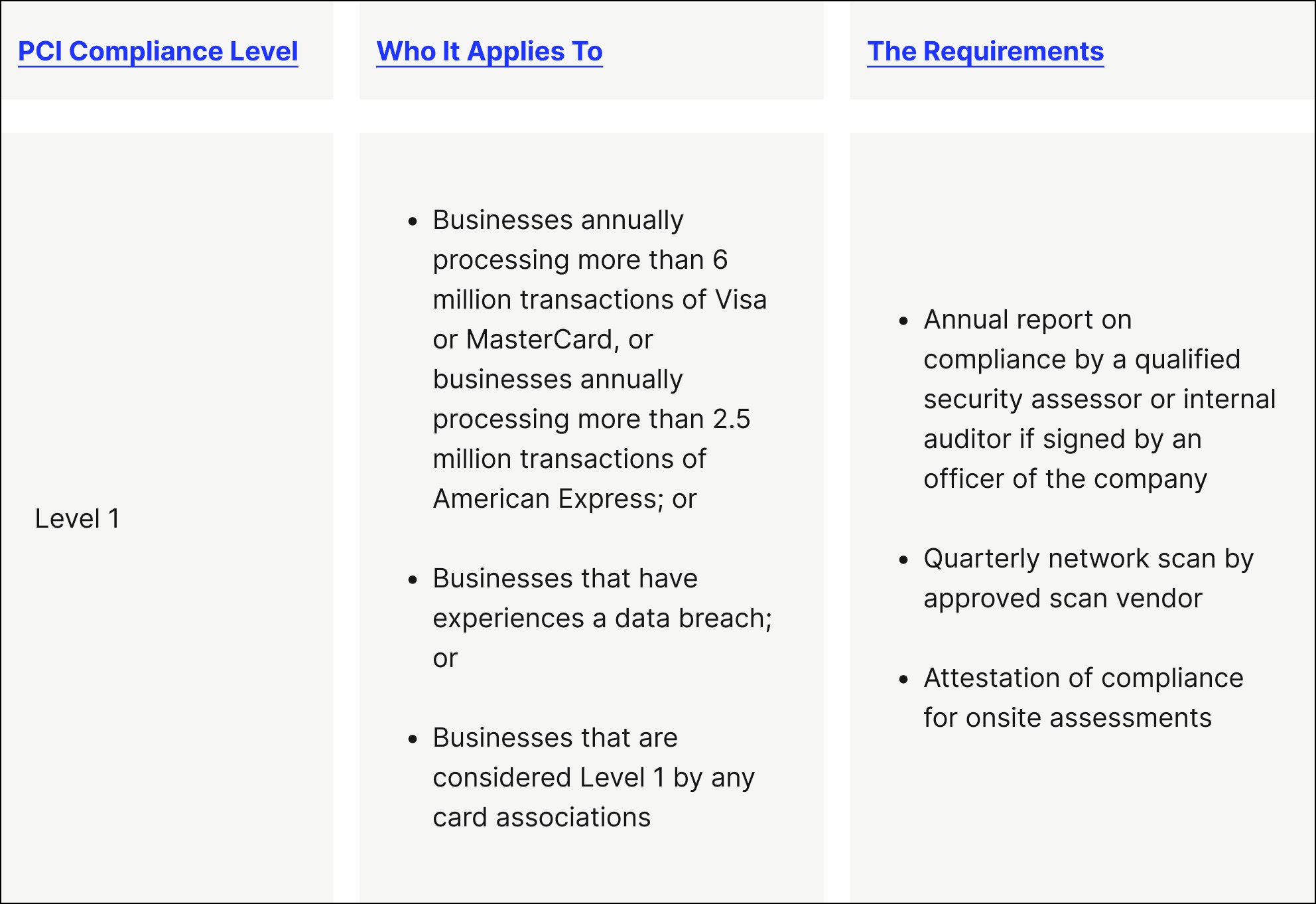 - PCI level 1 — This is the highest level of PCI compliance security requirements, intended for merchants that process over 6 million credit card transactions every year.