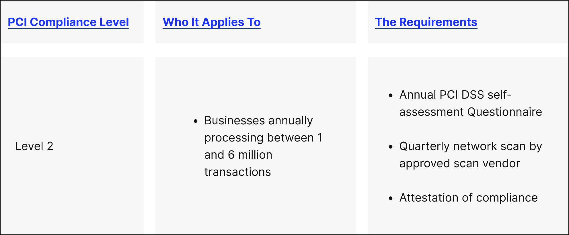 - PCI level 2 — This PCI compliance level is intended for merchants that process between 1 and 6 million credit card transactions every year.