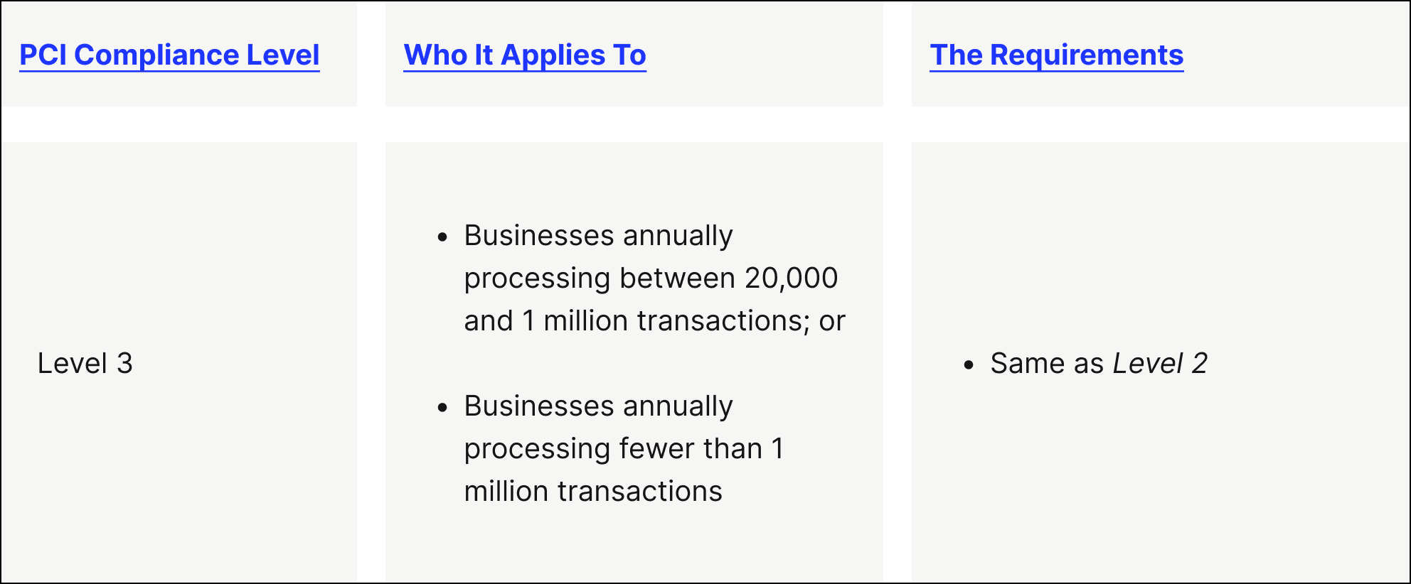 - PCI level 3 — This PCI compliance level is intended for merchants that process between 20,000 and 1 million e-commerce transactions every year.