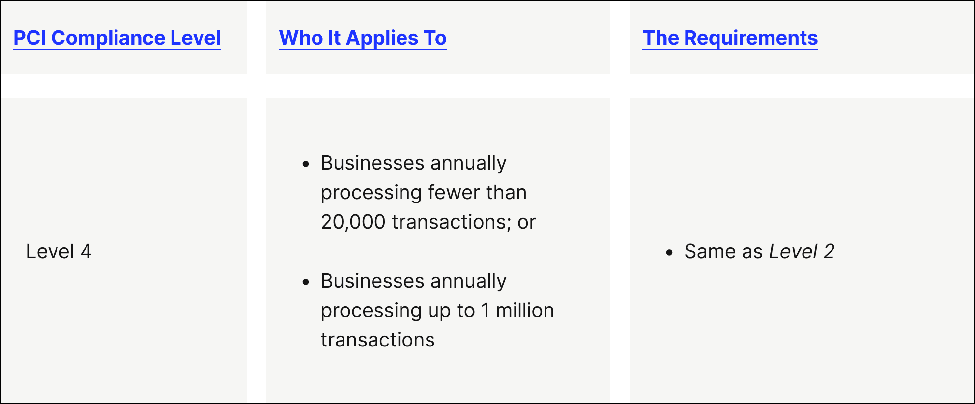 - PCI level 4 — This PCI compliance level is intended for merchants that process fewer than 20,000 e-commerce transactions or up to 1 million total transactions (regardless of the payment acceptance channel) yearly.