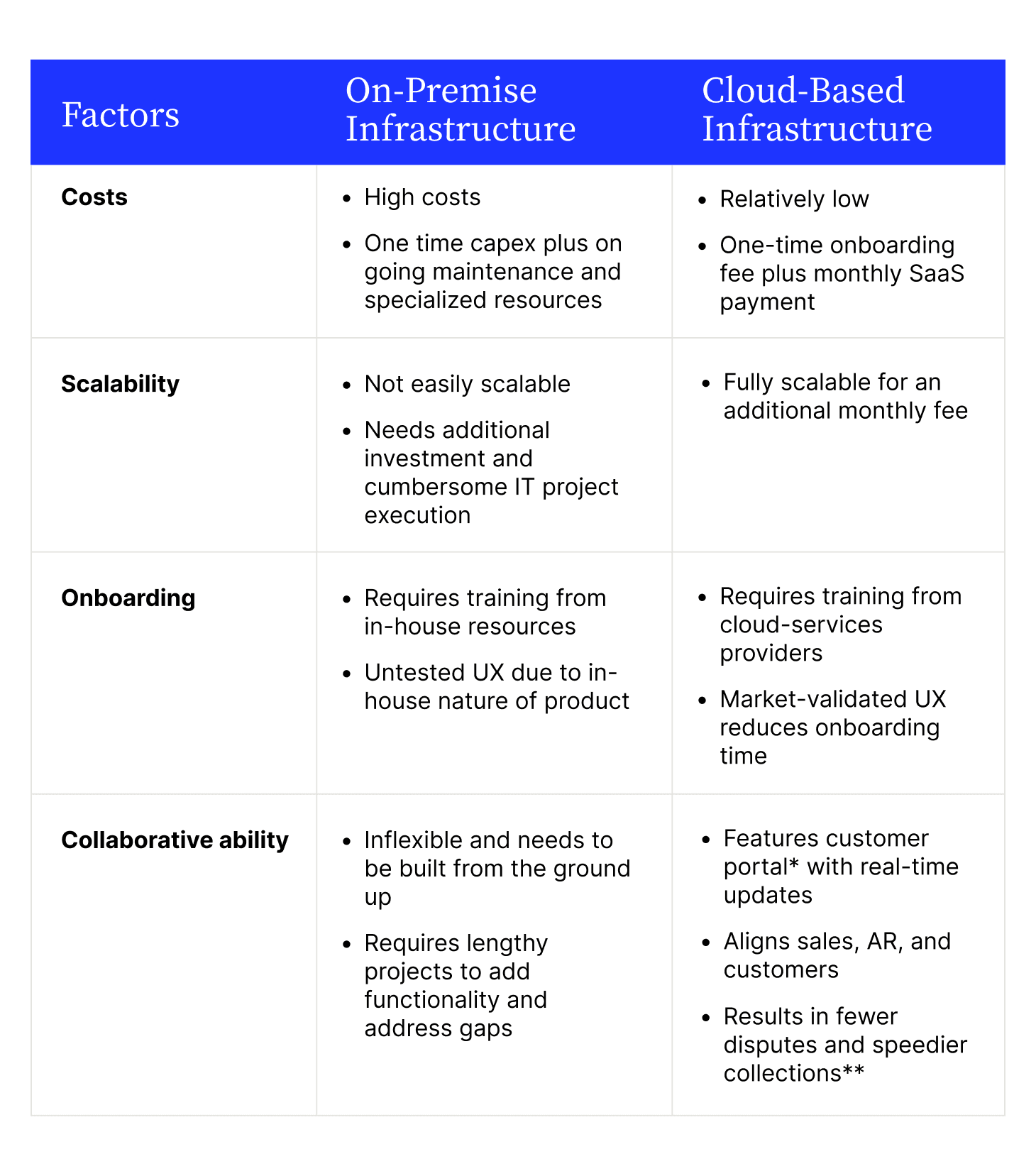 4) On-premise automation reduces flexibility—An on-premise solution isn't a one-off investment. It needs constant upgrades, security patches, and feature rollouts to remain relevant. These IT processes reduce your technological flexibility, creating roadblocks for customer-facing teams—and teams like accounts receivable who should strive to become more customer-oriented