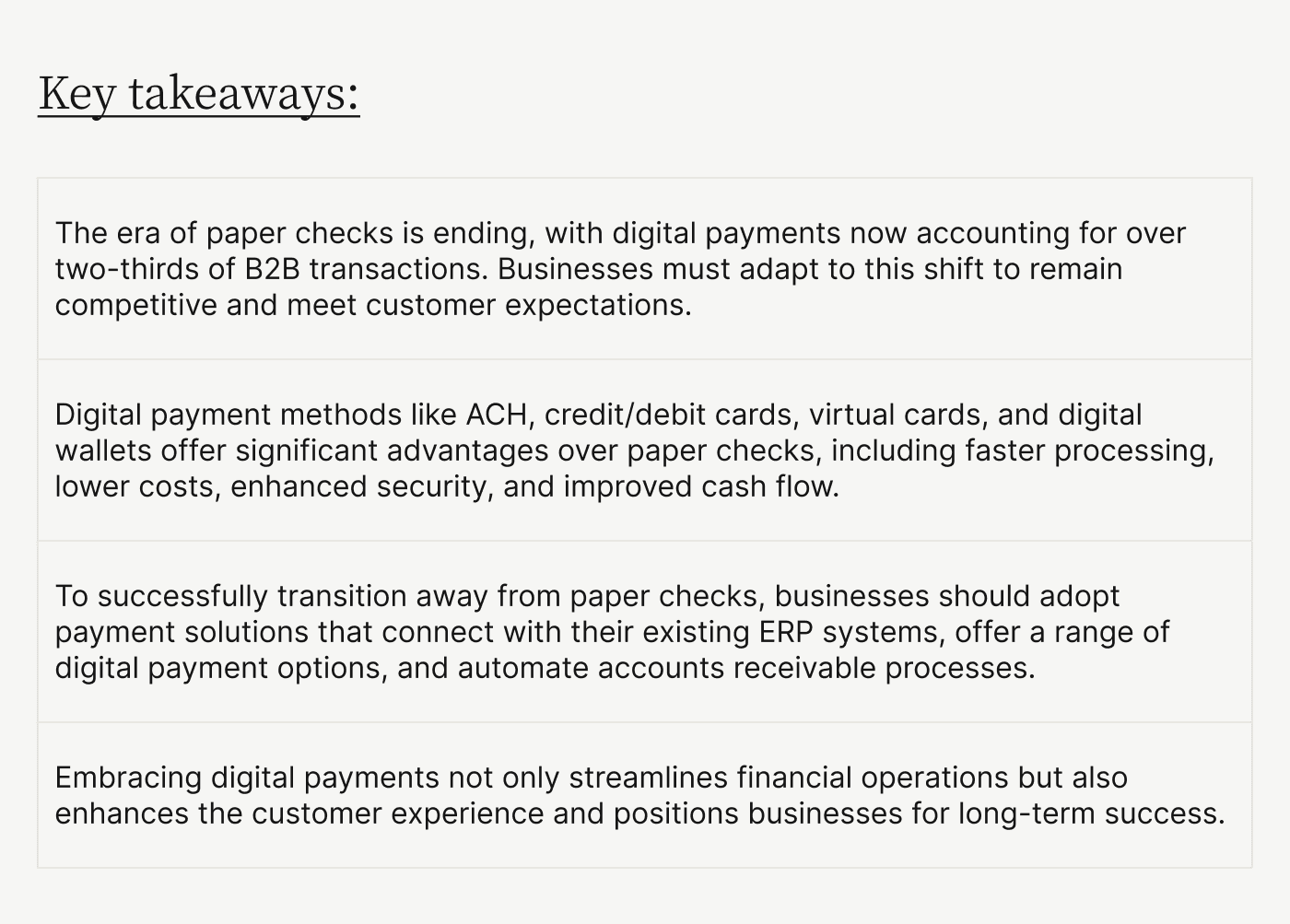 Adopting paper check alternatives—like digital solutions—will become a necessity as the B2B payment ecosystem evolves, and those who adapt now will be well-positioned to thrive in the years to come.