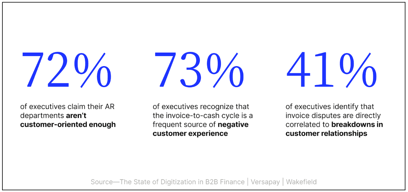 In another recent study, The Impact of Customer Experience on B2B Payments, more than 70% of executives said they’re concerned that their AR departments aren’t customer-oriented enough.