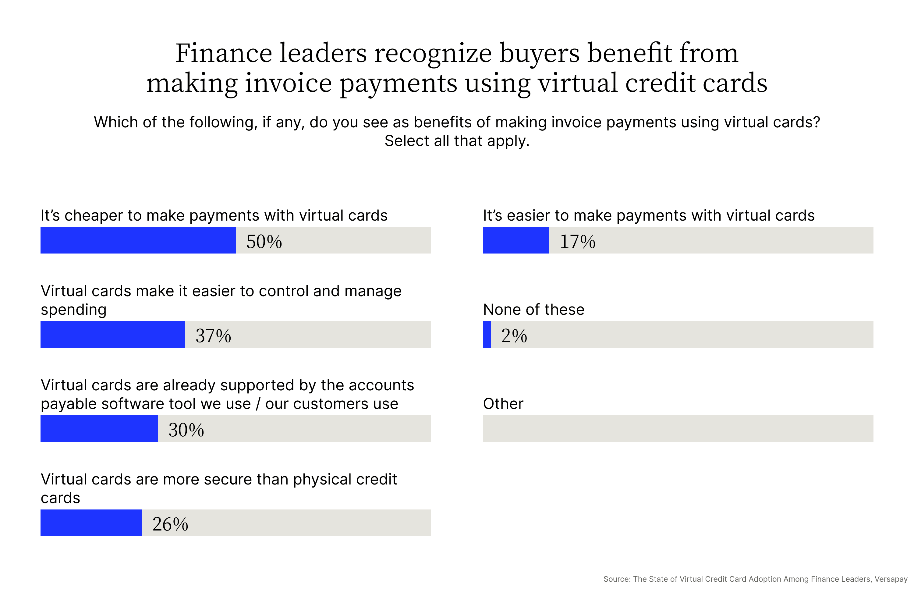 Tokenization and spend controls make virtual credit cards one of the most secure B2B payment methods because they are typically only used once. Controls can also be implemented on virtual credit card numbers to limit their use based on parameters like type of purchases, length of validity, and the dollar amount it can cover. There are numerous additional benefits to using virtual credit cards as B2B payment methods, which finance leaders are quick to recognize:
