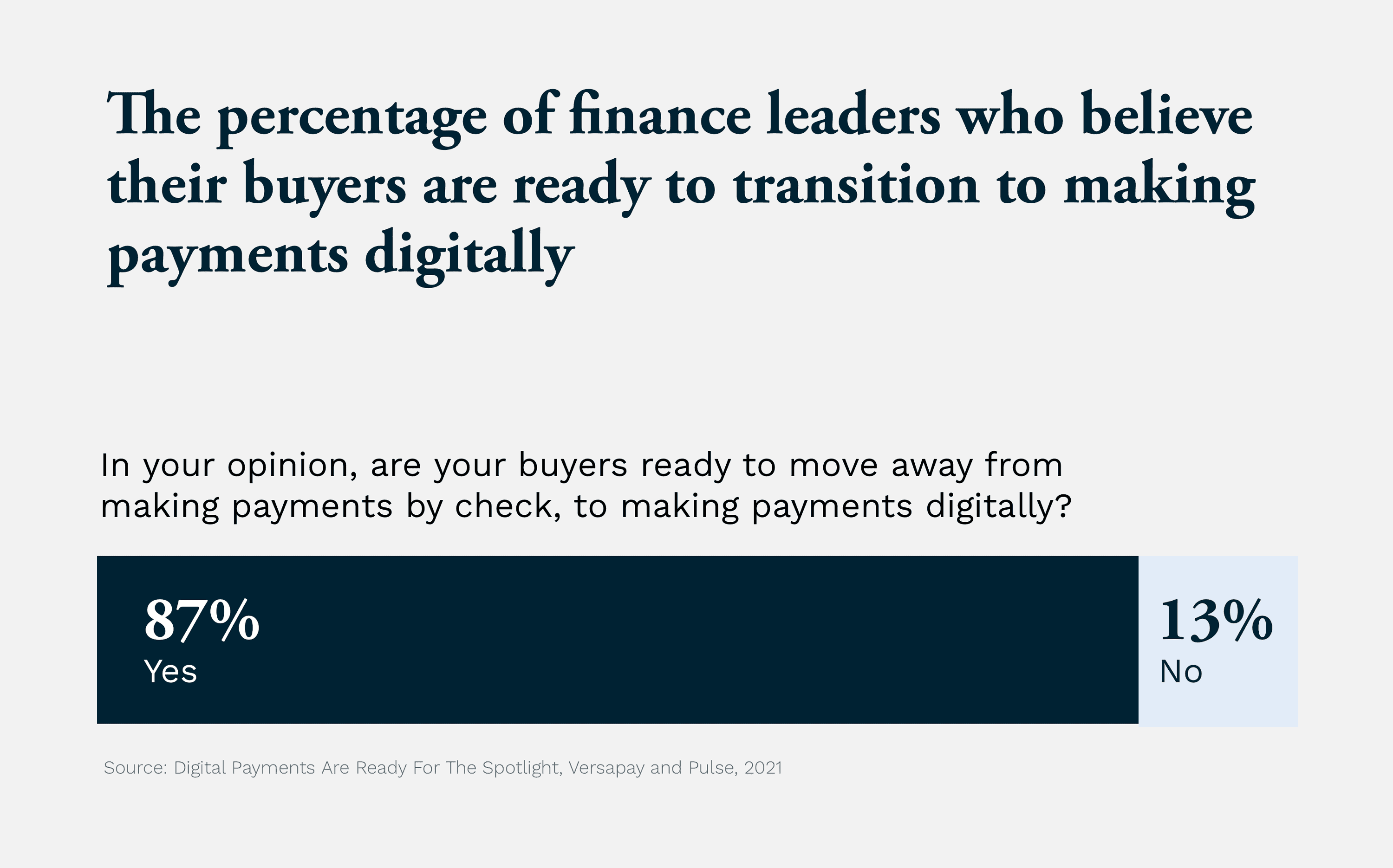 The good news is that digital B2B payment software can solve nearly all the challenges presented by their traditional, offline counterparts. And luckily, finance leaders believe their buyers are ready to transition to making payments digitally