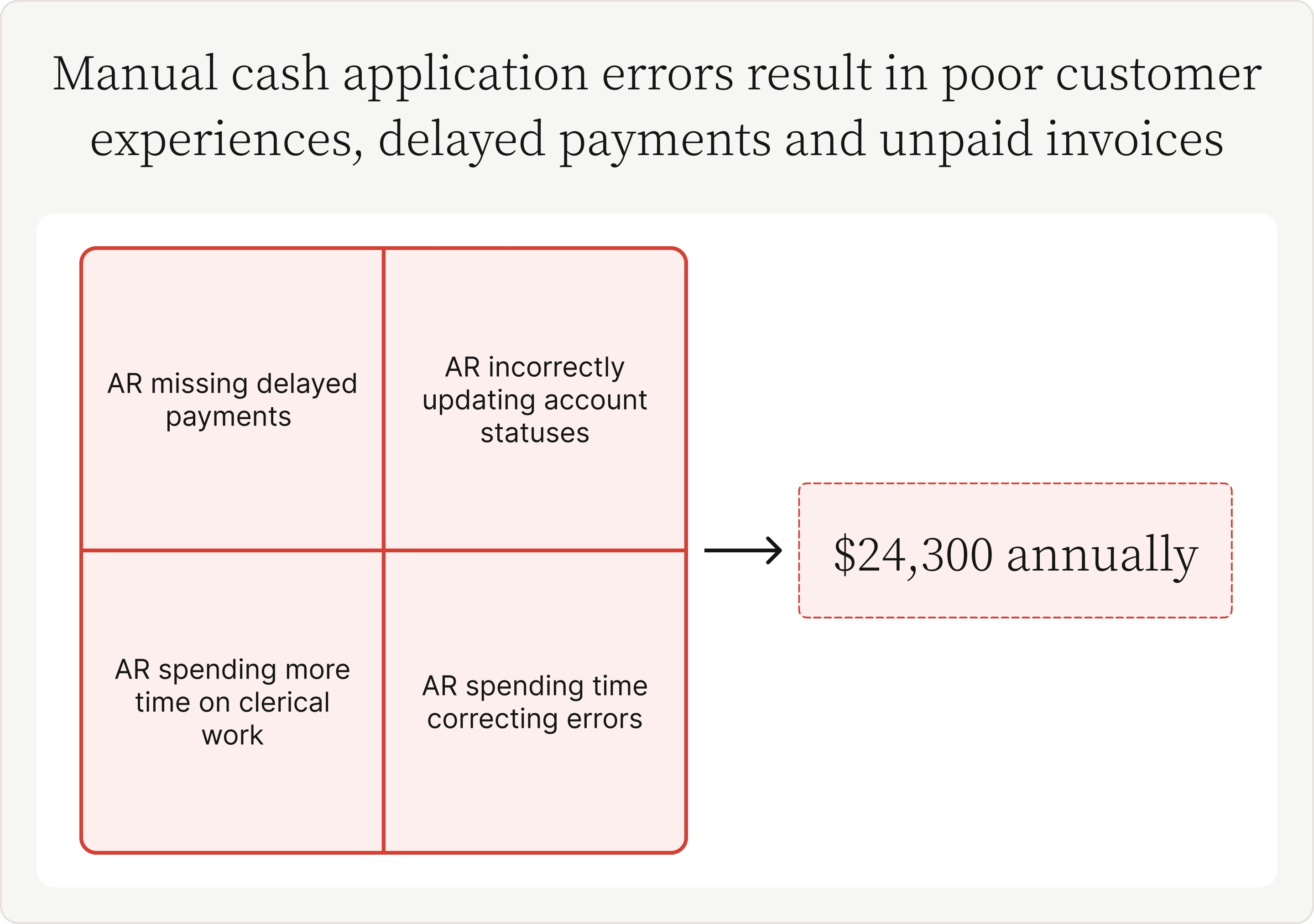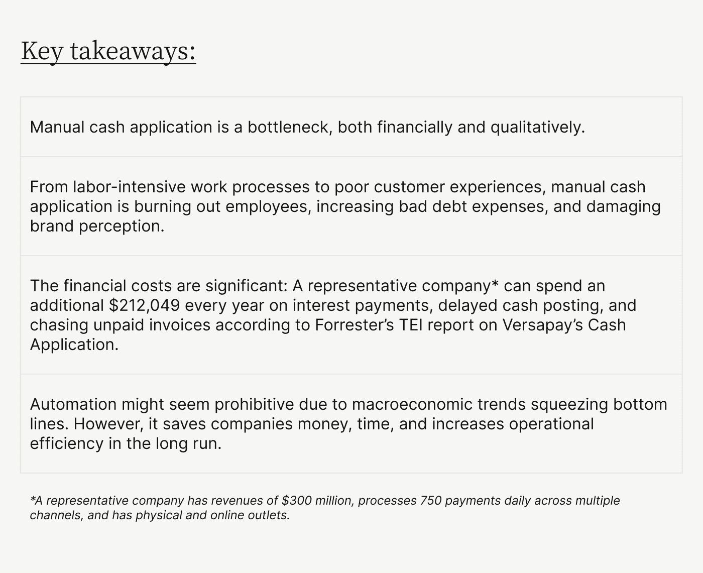 The manual cash application challenges we've highlighted above have significant costs. Forrester's report estimates these inefficiencies cost companies $212,049 annually. That number does not account for lost opportunities caused by poor CX or employee attrition caused by overwork and stress.