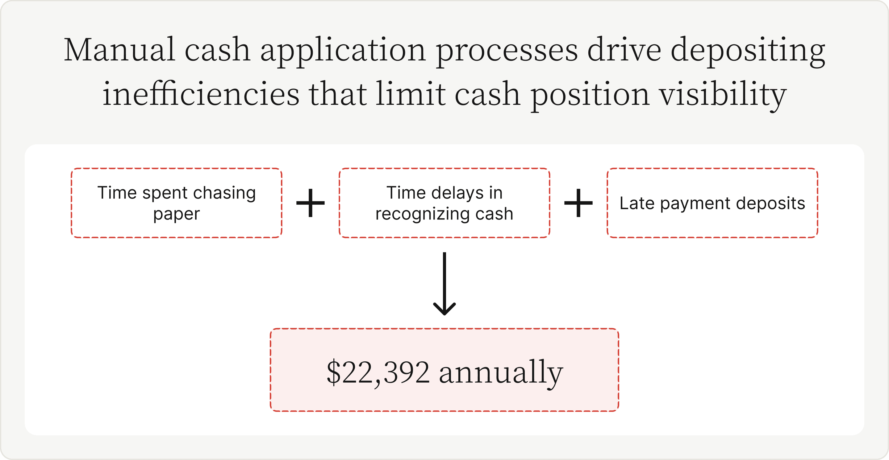 Per Forrester's TEI report, a hypothetical organization spends almost $90,000 annually on interest caused by inaccurate and delayed cash posting. These interest costs occur due to lengthy DSO times creating working capital holes forcing companies to seek external financing.