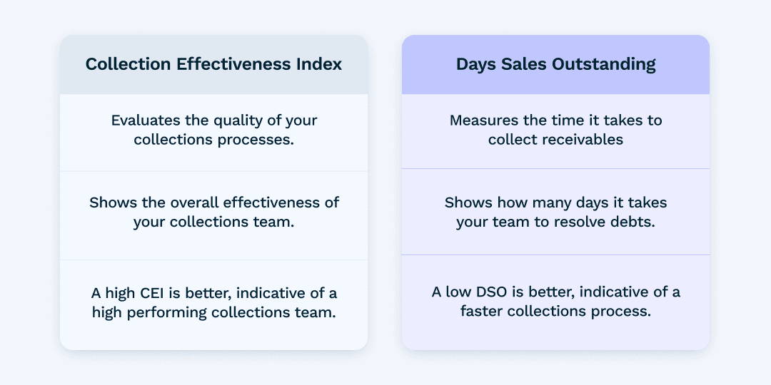 Days sales outstanding, conversely, measures the time it takes to collect receivables and shows how many days it takes your team to resolve debts. Plus, with DSO, a lower output is better, indicating a faster collections process.