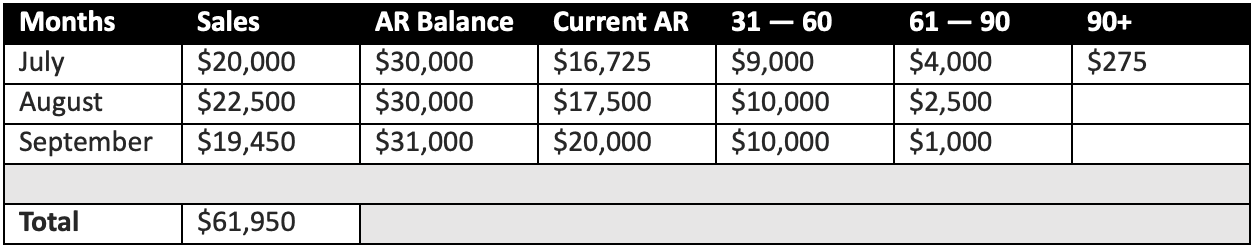 - Credit sales—$20,650 (assuming we’re calculating against a one-month period [$61,950 / 3])