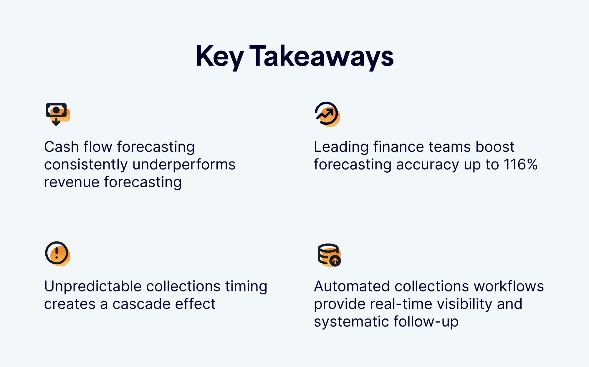 - Leading finance teams are pulling ahead by making collections timing predictable rather than just faster, with the best achieving up to 116% quarterly forecasting accuracy.