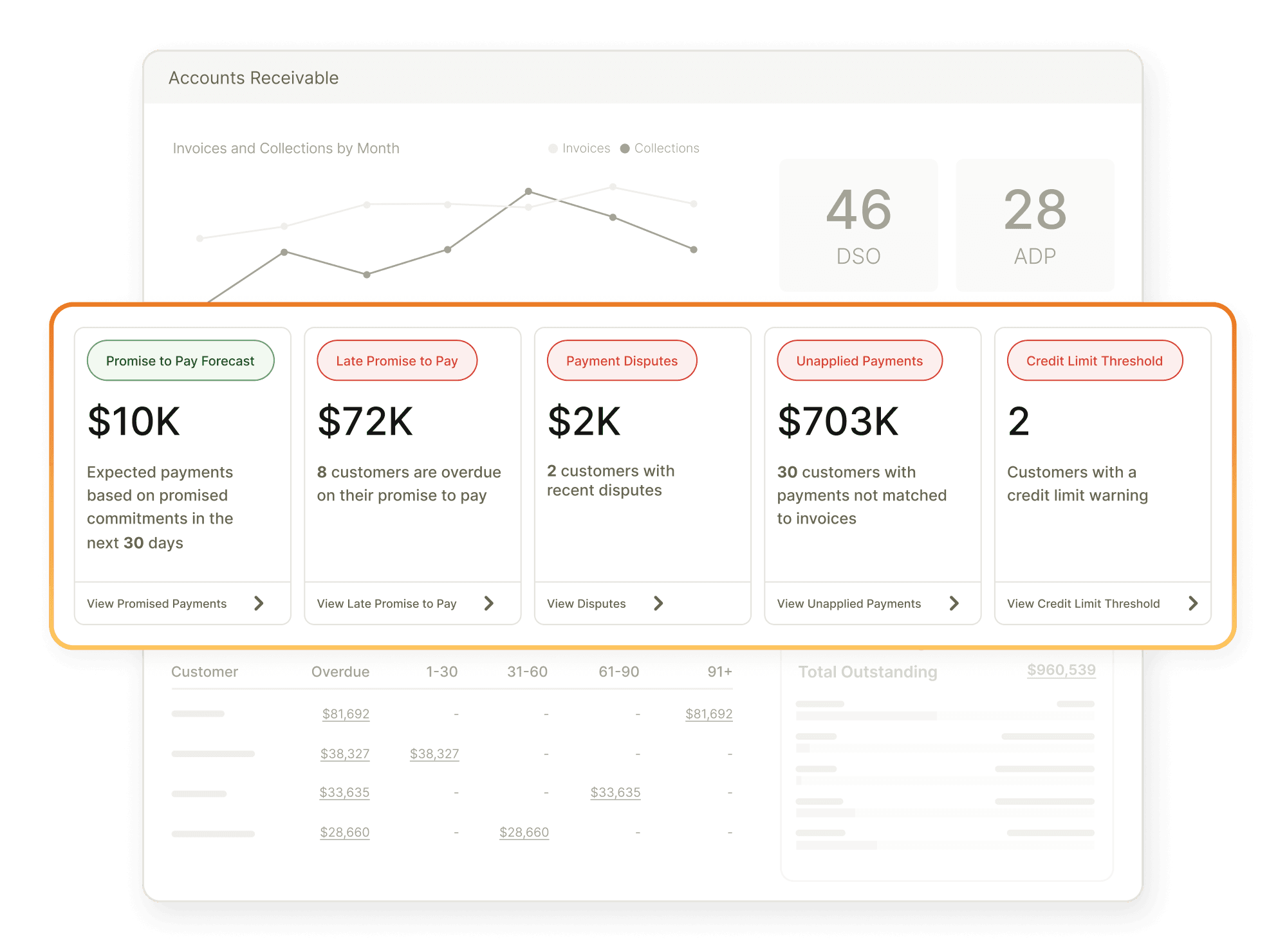 Track collection timing variance alongside traditional days sales outstanding (DSO) metrics. This gives finance teams the data needed to improve forecast accuracy while providing collections teams forecasting context for their activities.