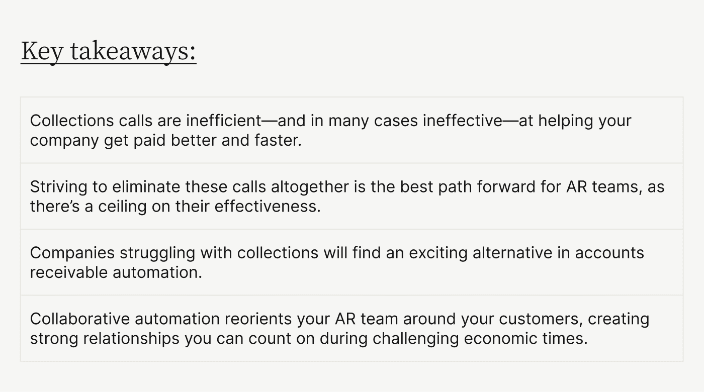 Collections calls have been a mainstay of AR operations for so long that teams might balk at doing away with them entirely. One could argue that the process simply needs to be improved in some way to become more efficient.