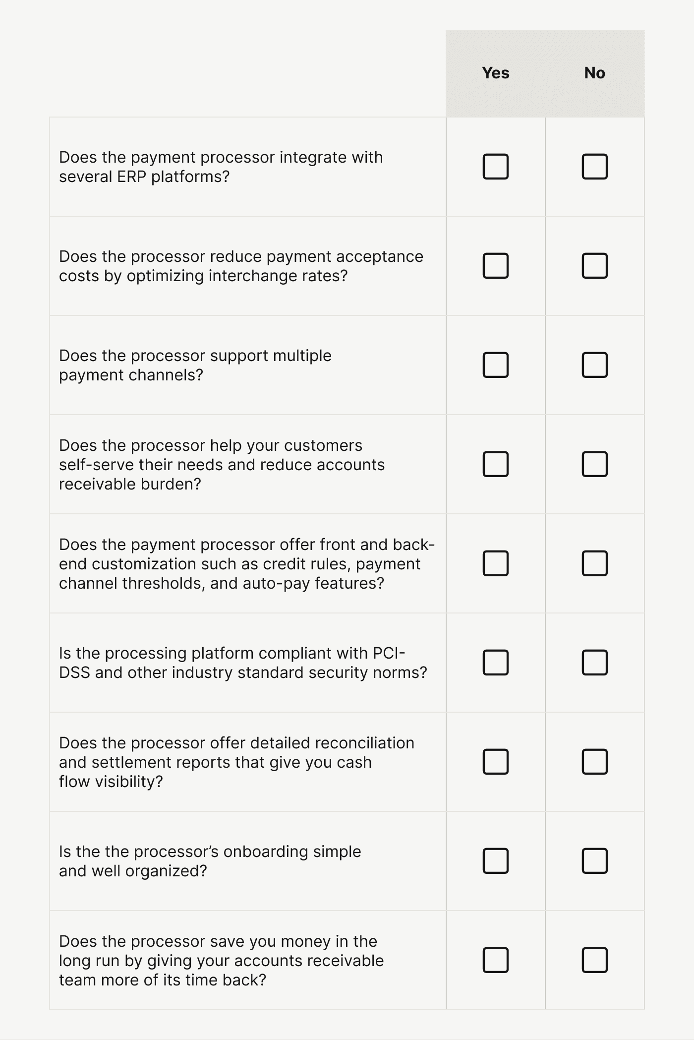 Supports multiple payment channels: Ensure your processor can support all the B2B payment methods your customers want.