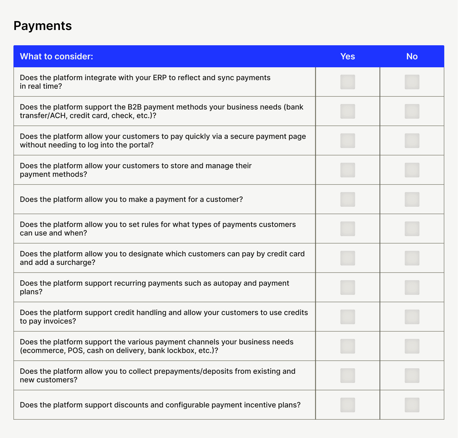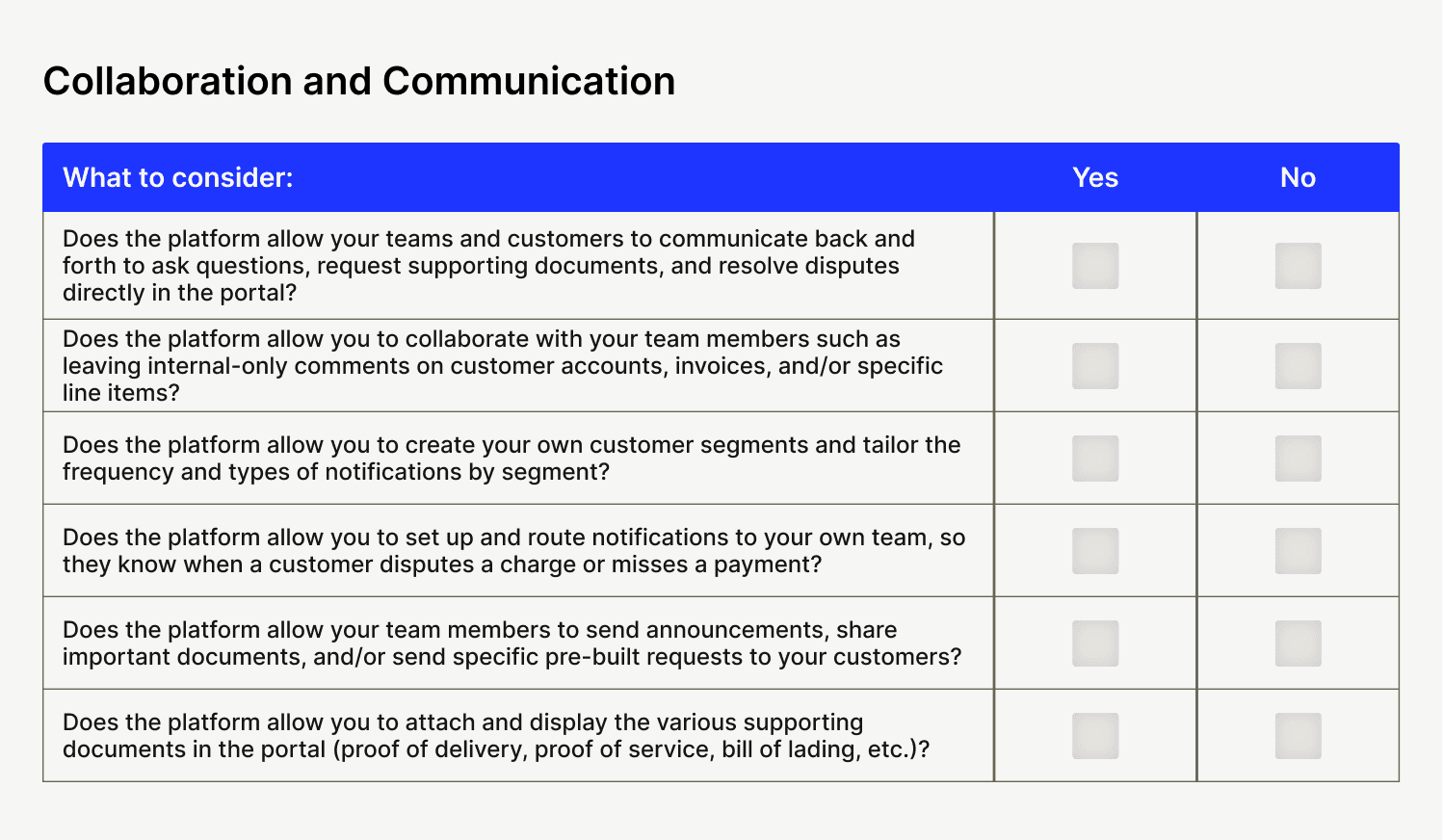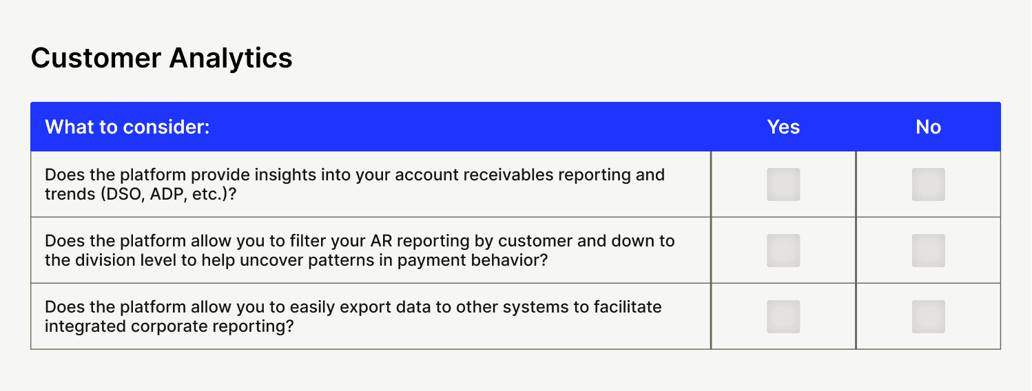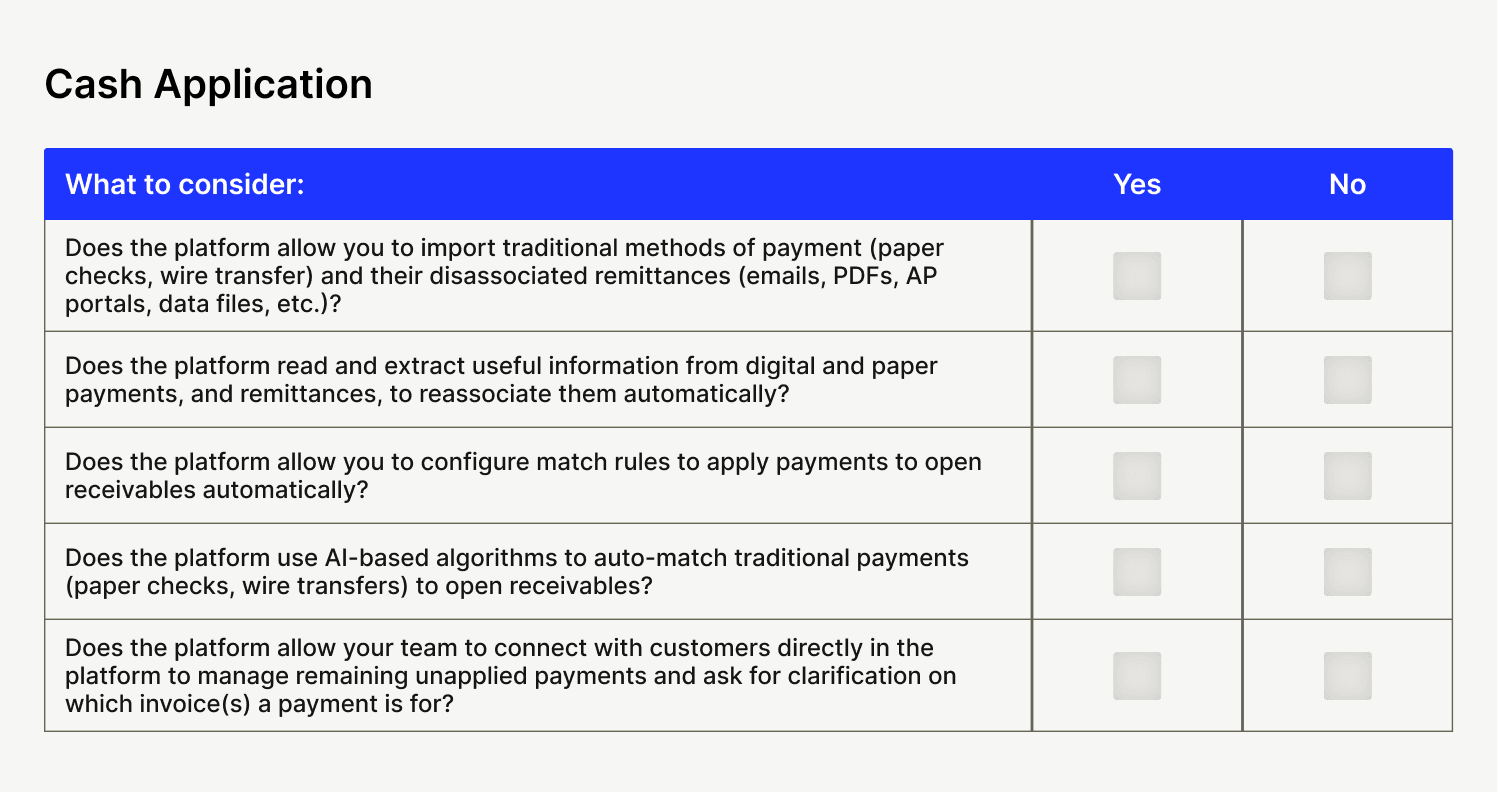Below are 12 evaluation criteria buckets designed to help you cut through the noise when choosing accounts receivable automation software. Each has its own checklist, so you know just what features to look for during your search.