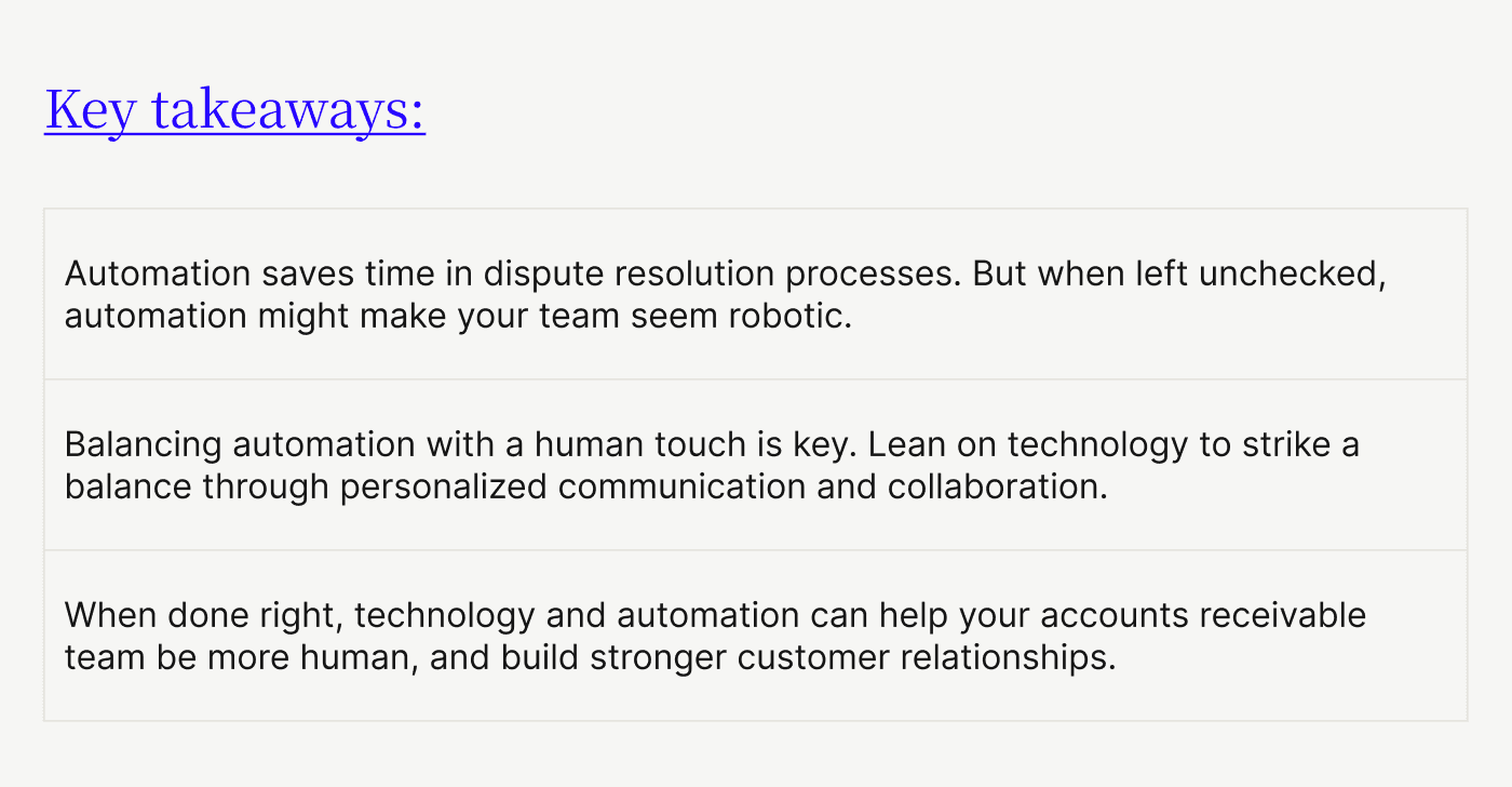 At first glance, balancing automation and a human touch in dispute resolution might seem challenging. Yet ironically, when implemented thoughtfully, automation can enhance the human element in accounts receivable processes. Data and technology are the keys to achieving this balance. Specifically: