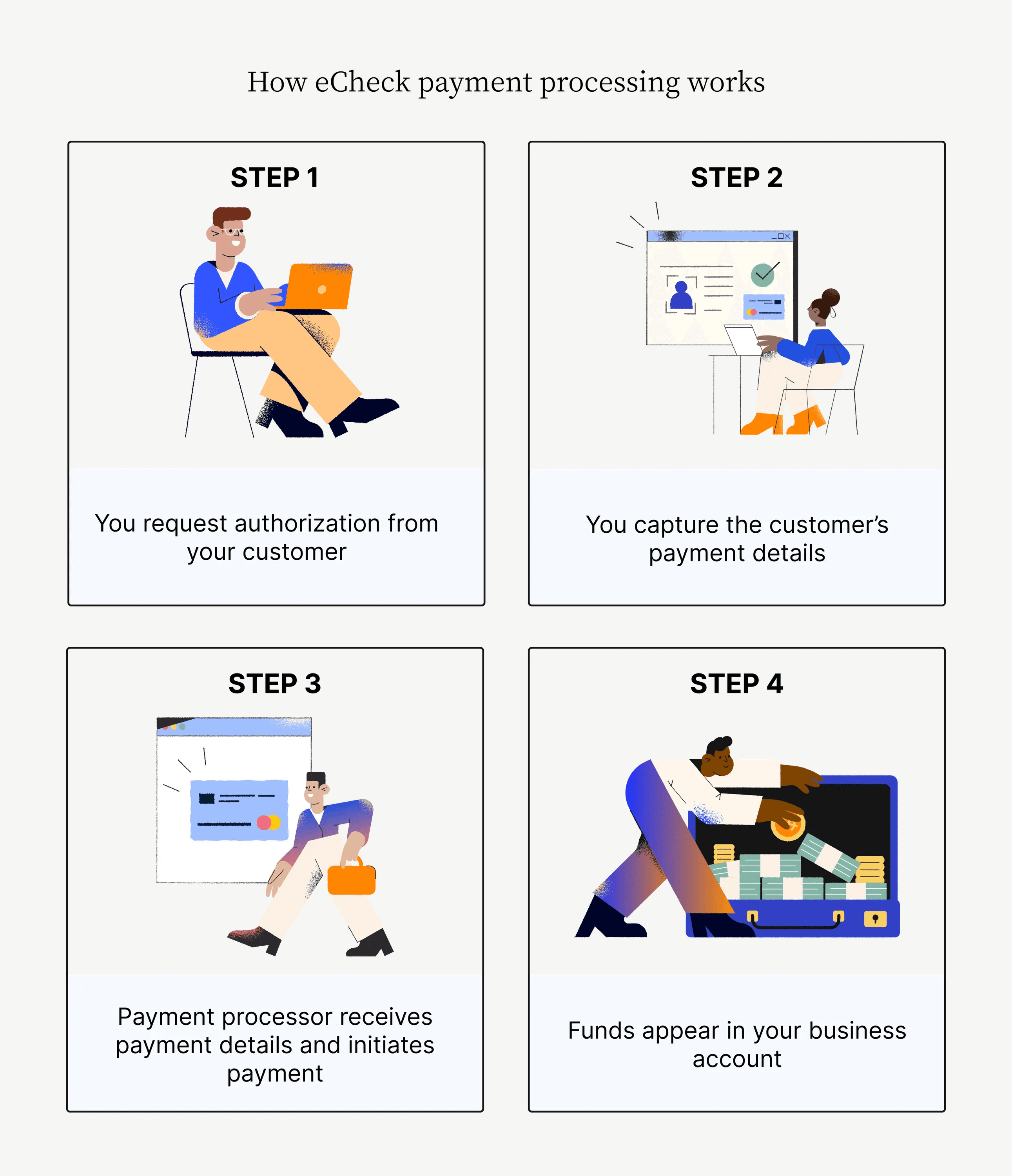 Compared to paper checks, eChecks don’t require the same upfront effort from customers to write and mail them. You also don’t need to wait for an eCheck to arrive in the mail before processing the payment. This cuts down the overall eCheck payment time significantly.