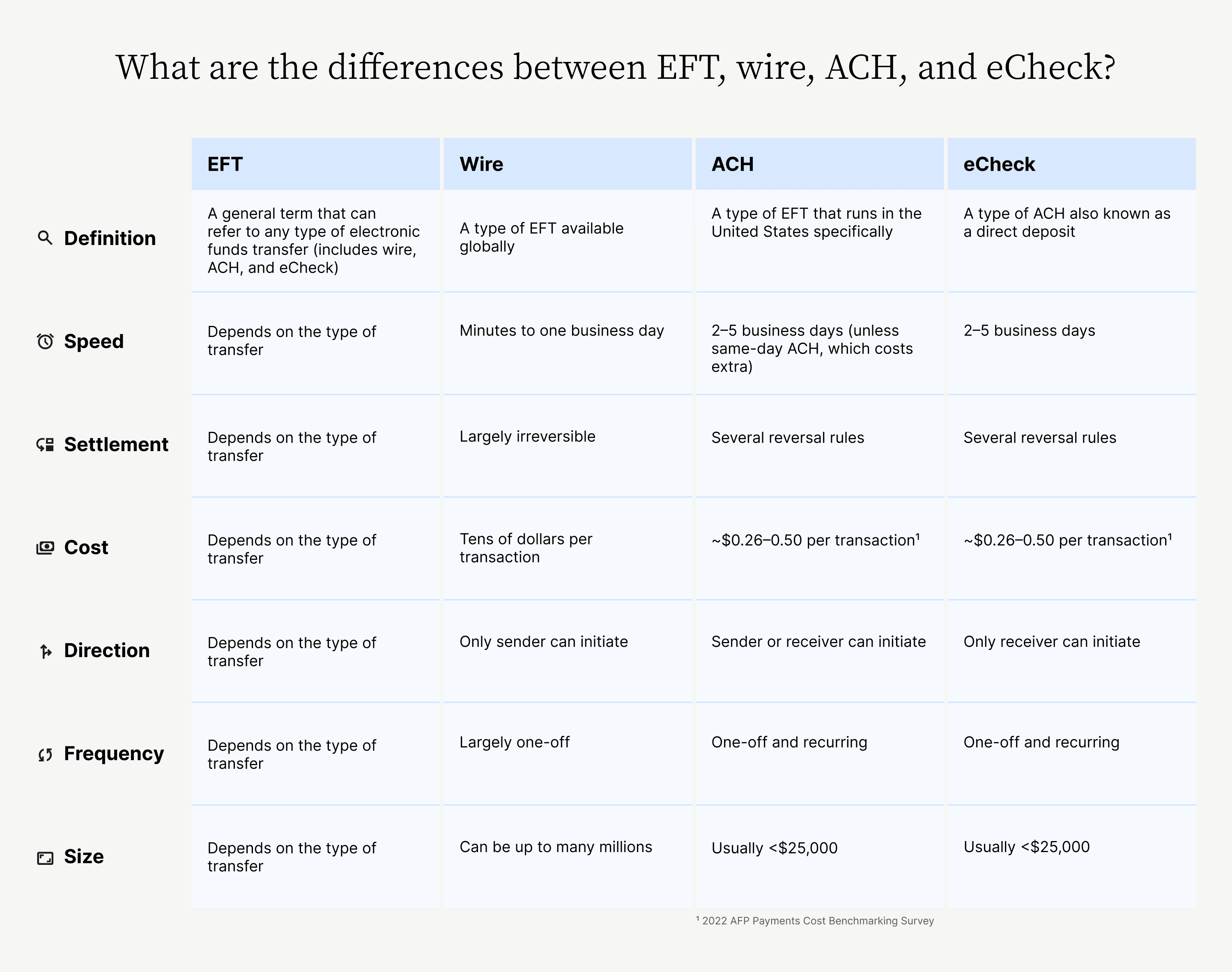 Electronic Funds Transfer (EFT) is a term that gets used interchangeably with ACH, but it’s worth noting the difference. EFT is a more general term referring to any type of electronic fund transfer from one bank account to another.